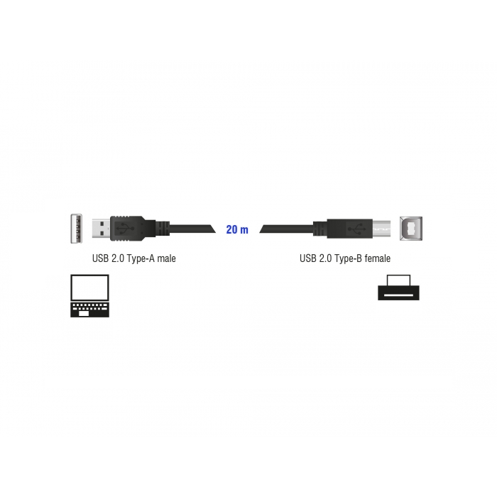 Very long USB cable, 20m, for USB 2.0 and USB 1.1, with 2 integrated repeaters, USB 2.0 High Speed (480 Mbps), plug A to plug B, high quality, colour: black
