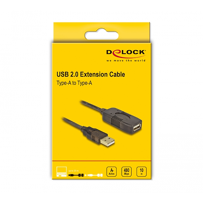 This USB 2.0 cable by Delock can be connected to an active USB port and enables an extension of 10 m. By connecting of an additional 10 m extension cable you can extend your USB port up to 20 m.