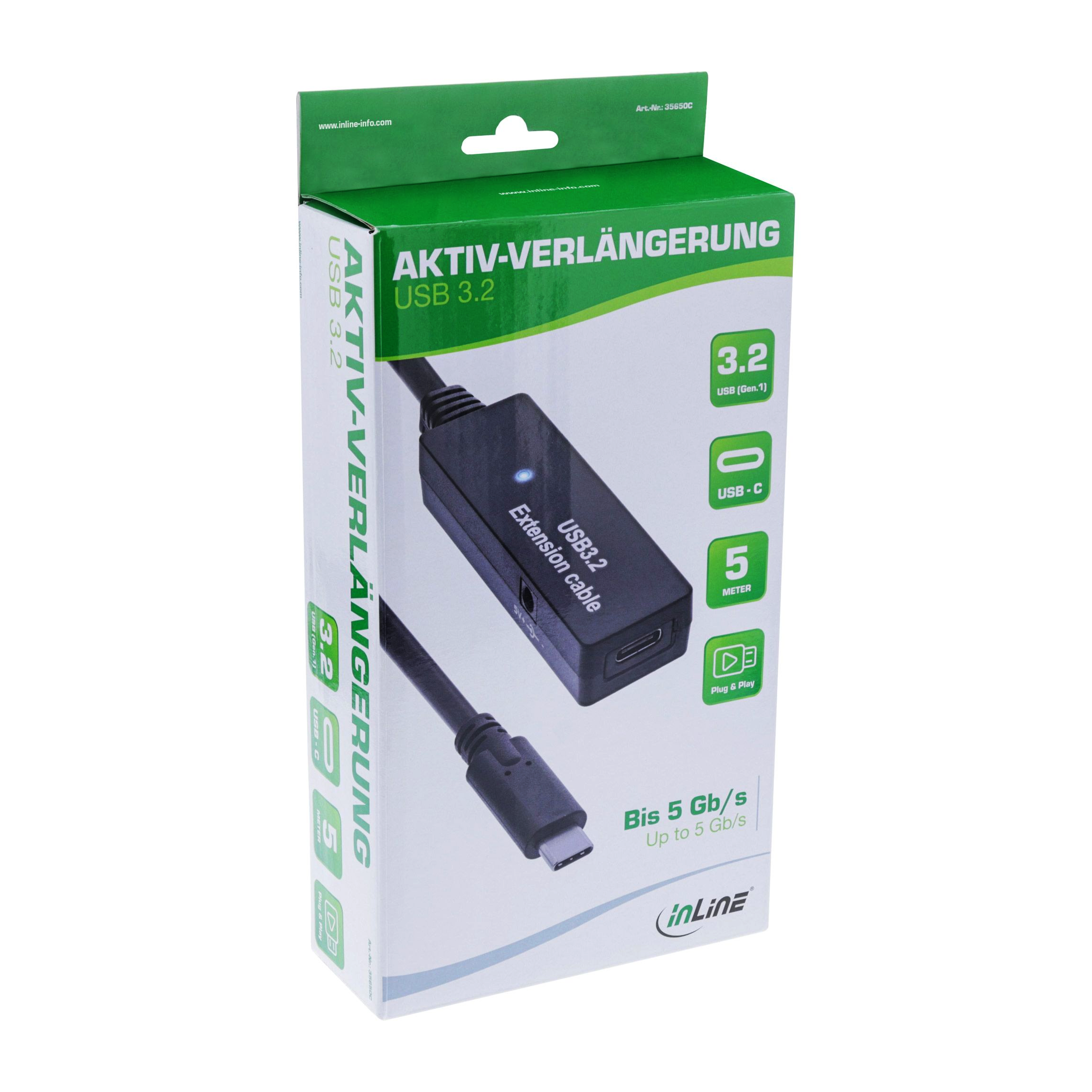 USB C to C active extension, 5 m, 5 Gbit/s, USB Type-C™ male to USB Type-C™ female, USB 3.2 Gen.1, with integrated signal amplifier (without power supply)