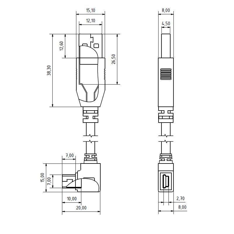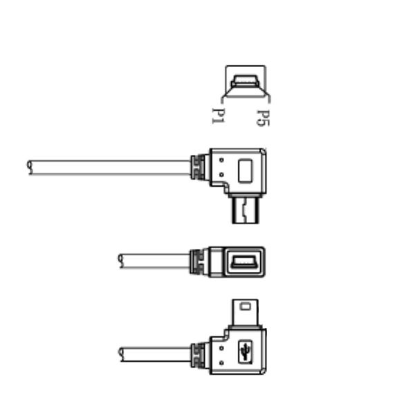 - Connection 1: USB 2.0 plug type Mini-B male 90° angled RIGHT (to peripheral device / downstream)