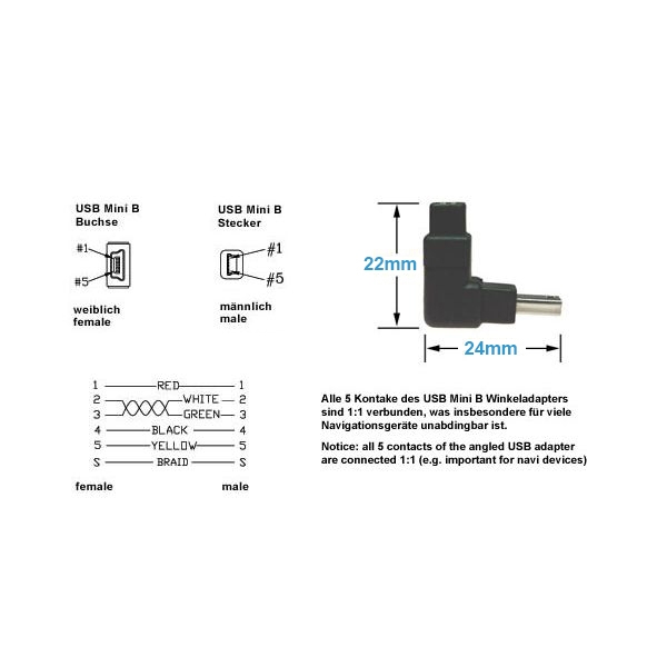 Angled USB 2.0 Mini B adapter, USB Mini 5 male to USB Mini B female (5 pin), angled 90° to the REAR, all 5 pins connected 1:1 (e.g. recommended for navigation devices)