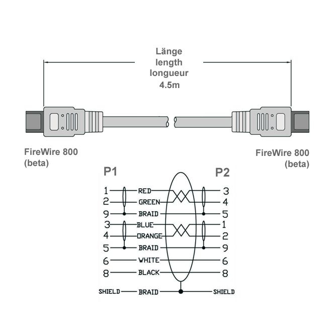 Firewire 800 cable 9 pin to 9 pin PREMIUM QUALITY, black, 4.5m
