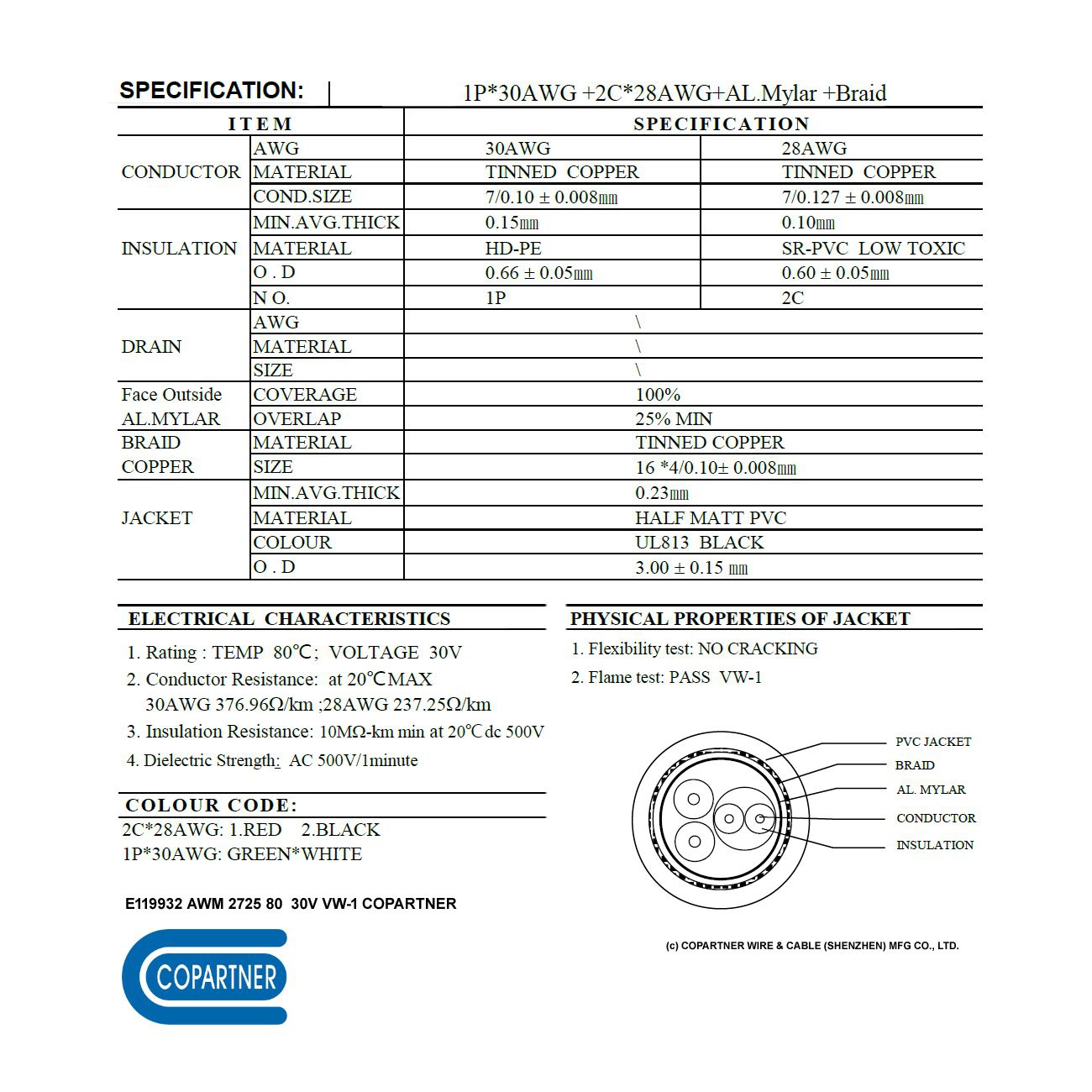 - Copartner cable with UL 2725, VW-1, 30V, 80°C