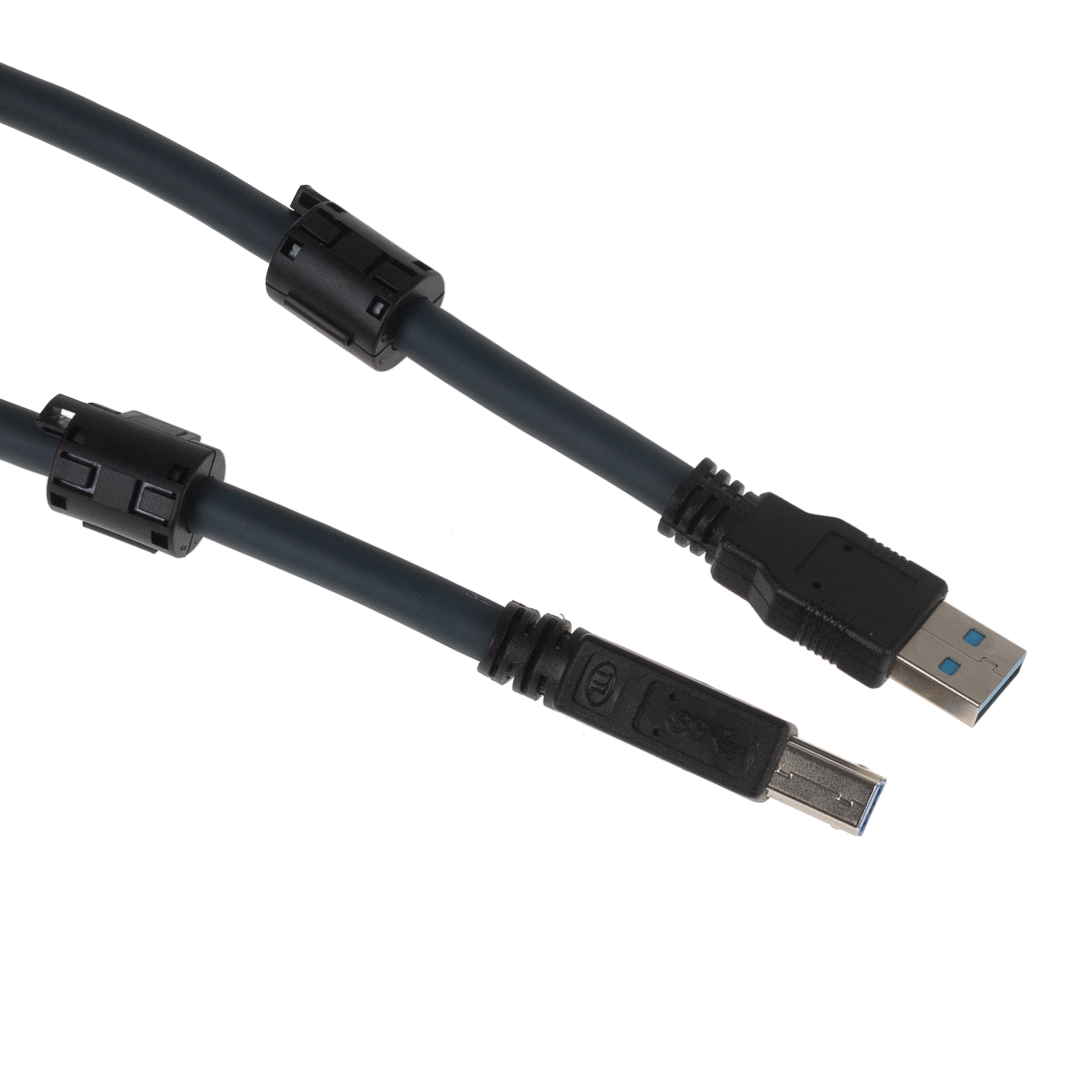 Flexible USB 3.0 cable, 5m, quality PREMIUM+ with 2 ferrite cores, AWG 22/28, double shielded, Super Speed Mode (max. 5Gbps), USB3 A plug male to USB3 B plug male, colour: anthracite blue
