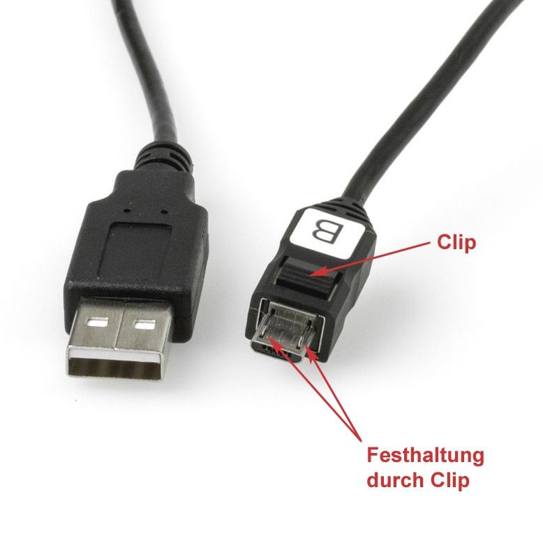 MICRO USB cable 50cm: USB plug A to USB Micro B plug (with clip to fasten the connector), thin and flexible cable (AWG30), black