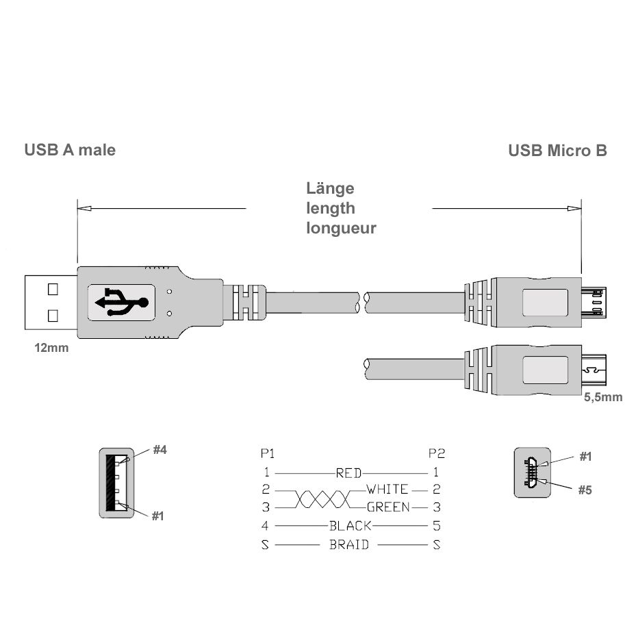 - Connection 2: USB 2.0 Micro B male 5-pin (4 pins occupied)