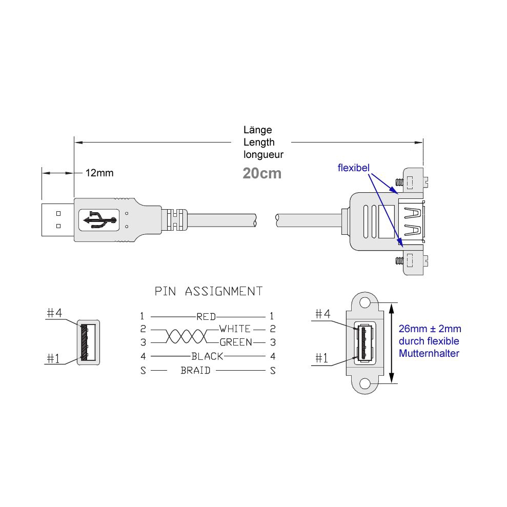 Mountable USB cable for industrial applications, plug type A (male) to type A female (mountable with 2 screws), 20cm, double shielded, twisted pair, for USB 1.1 und USB 2.0 (up 480 MBit/s)