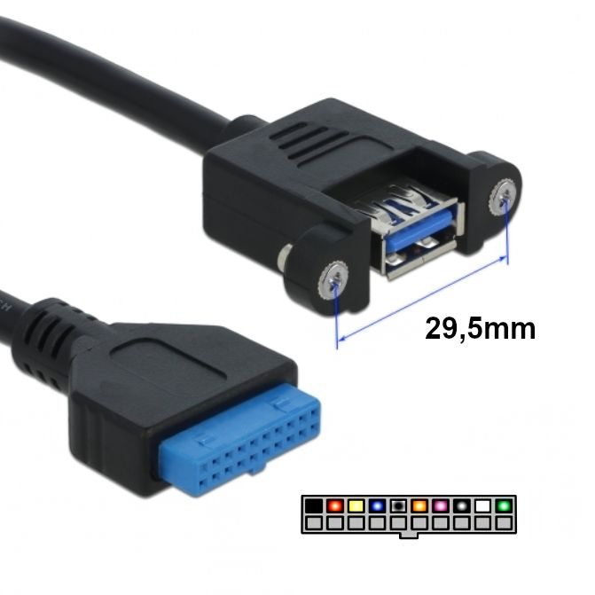 Mountable USB 3.0 cable, 50cm, for industrial applications, A female (mountable with 2 screws) to 20 pin board connector, USB 3.0 Super Speed, screws included, screw distance 29.5mm