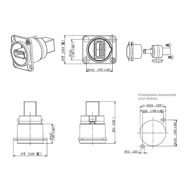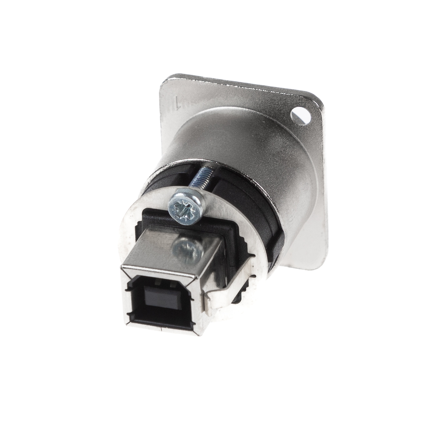 Mountable USB adapter for industrial applications (wall outlet, screw-on type) , A female to B female (pivotable receptacle core, A or B at front side), colour: silver