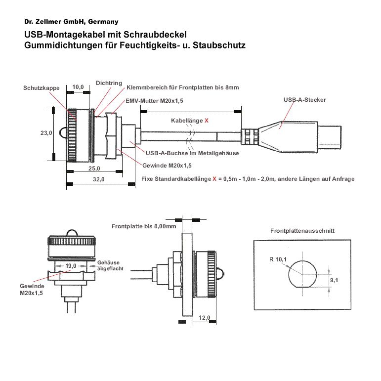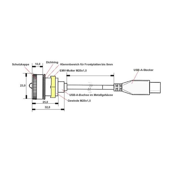Mountable USB cable with cap, water and dust protection (IP), USB type A female in metall case to USB plug type A male, for USB 1.1 and USB 2.0, 25cm