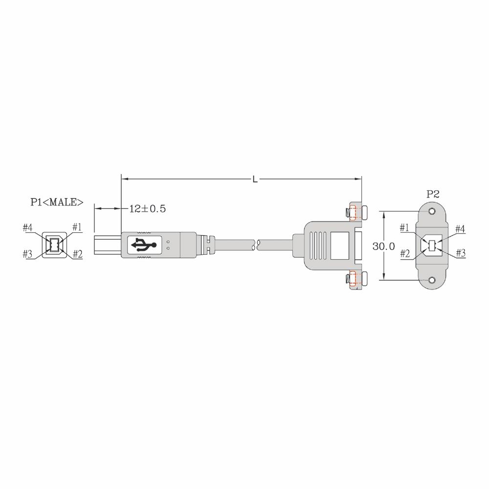 Panel mount USB 2.0 cable, B female with screws to B male, 2m