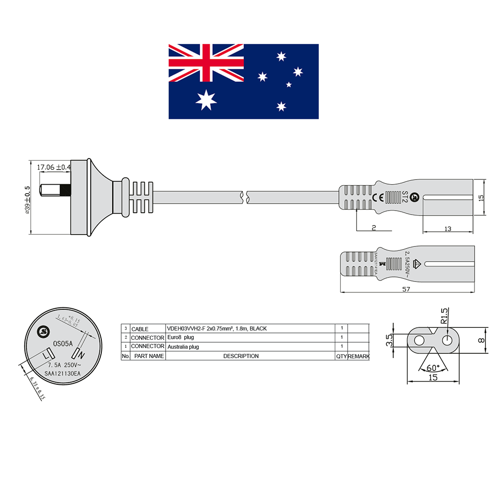 Power cord for AUSTRALIA with EURO 8 plug 180cm
