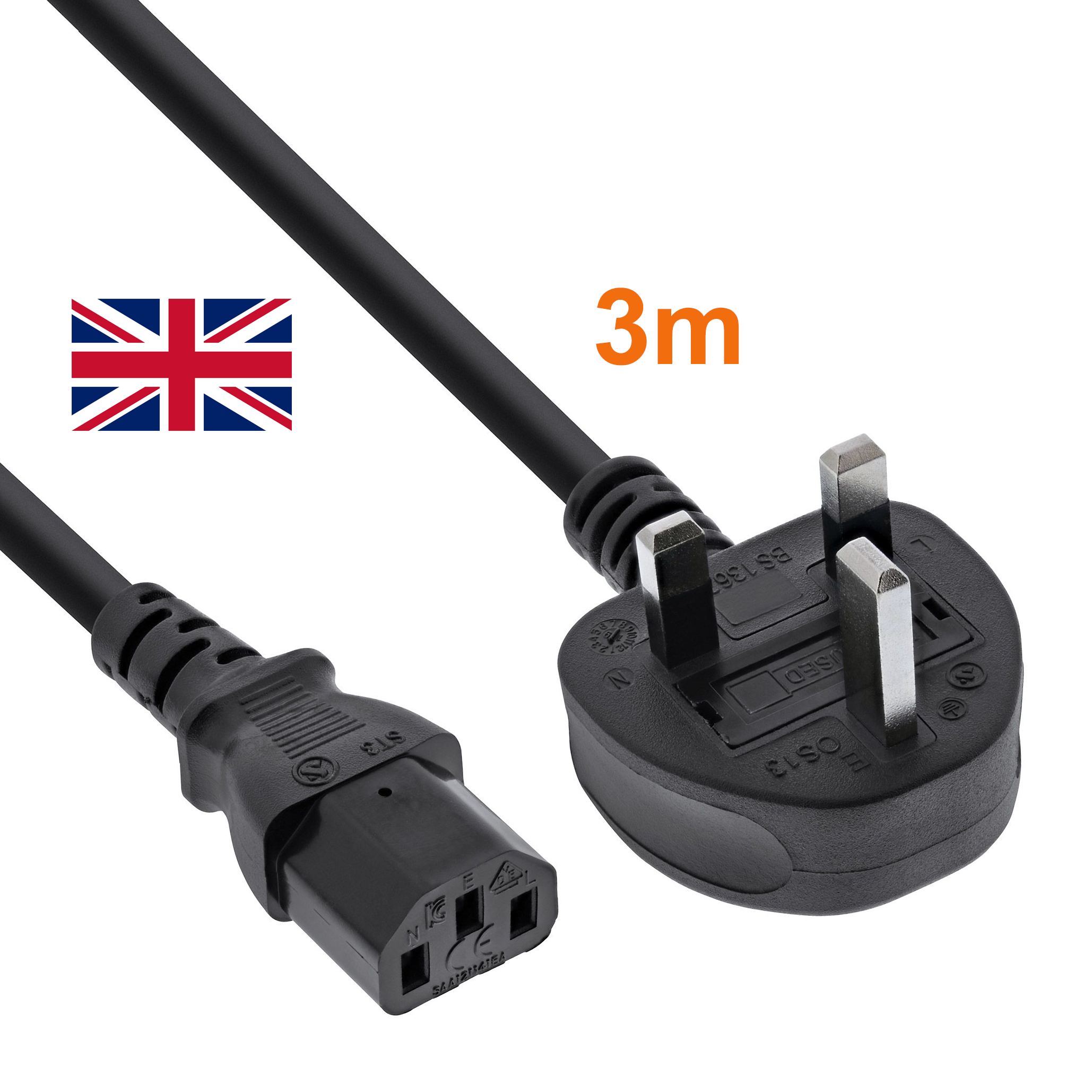 Power cord for United Kingdom / Ireland, 3m, 240V, BSI or ASTA, 3 x 1mm², fuse included 10 Amp, IEC 60320 w/C13, black, RoHS