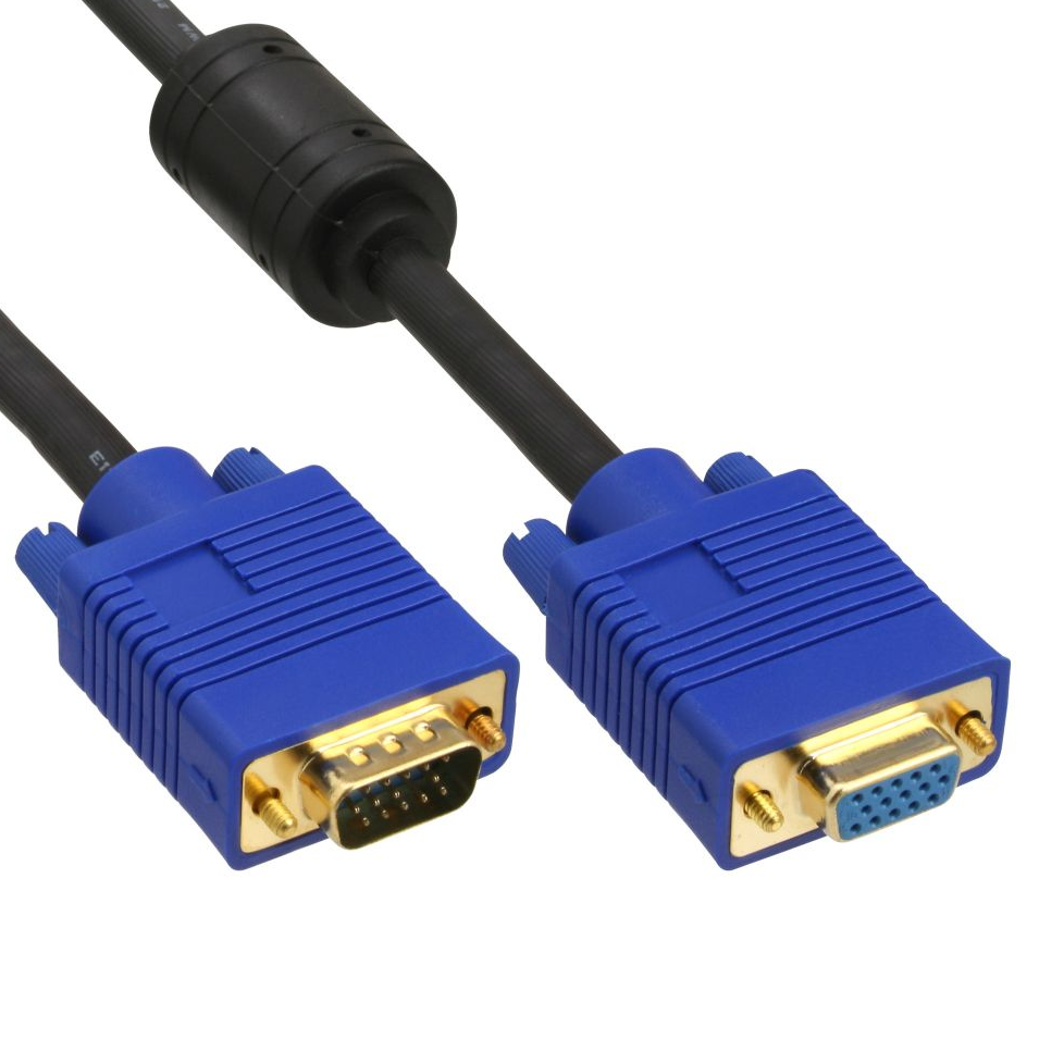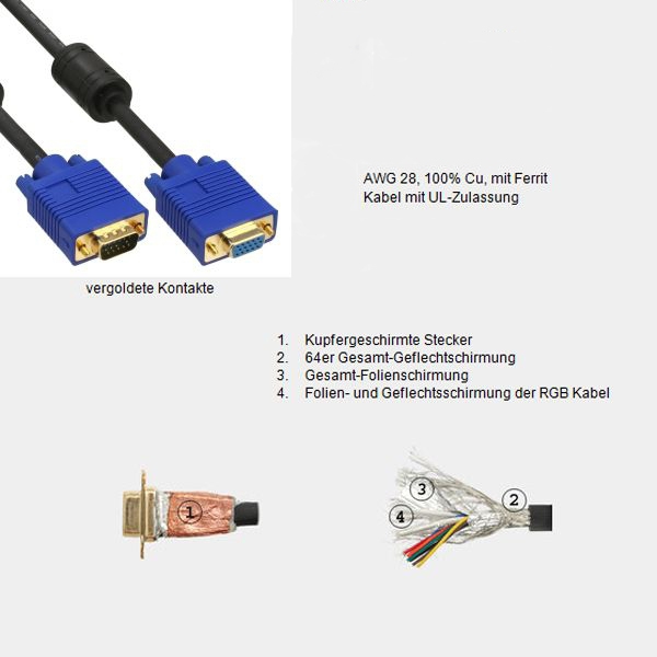S-VGA Monitor cable 5m, HD-DB15 male/lfemale, quality PREMIUM-plus for industrial applications, 2 ferrite cores, 4x shielded, gold plated plugs, black with blue plugs (meets PC-99 standard)