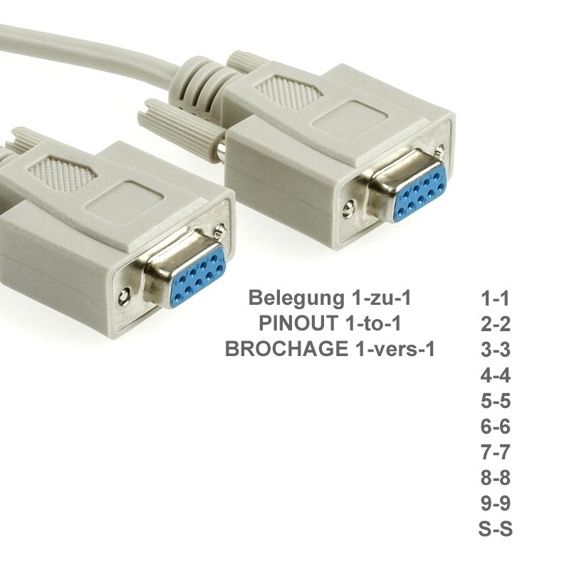 - all 9 contacts connected 1-to-1 (no NULL modem pinout)