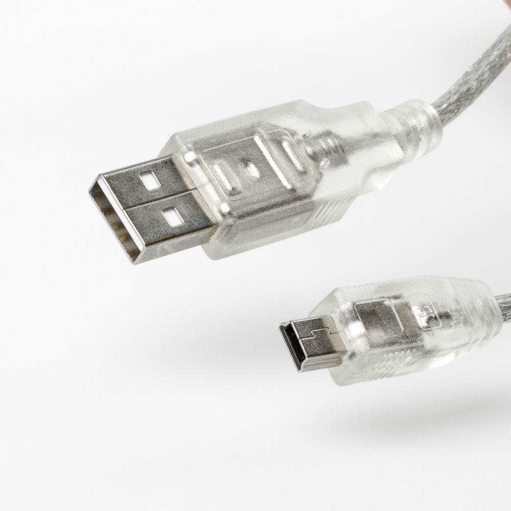 Very short USB cable with mini B plug (5-pin), 20cm, e.g. for Sony, Casio, Canon, HP, Panasonic, Konica, Yakumo od. Olympus, colour: silver translucent