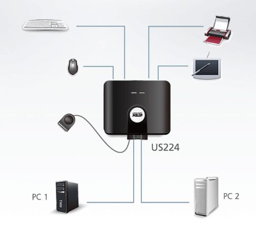 USB 2.0 Switching HUB, 2 PCs share 4 USB devices, ATEN US224