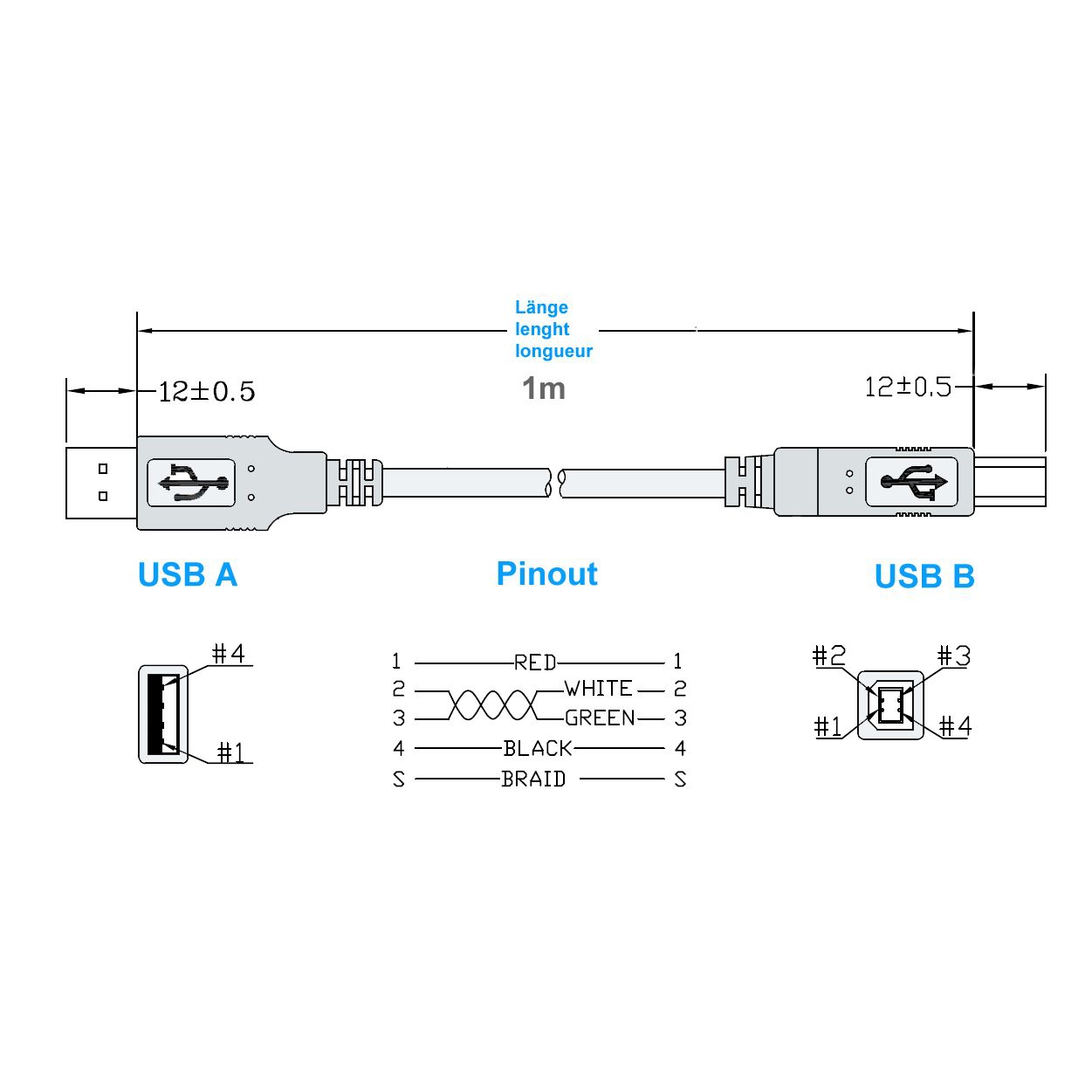 USB cable, 1m, for USB 2.0 and USB 1.1, high quality (28AWG1P / 24AWG2C), USB plug A to USB plug B (USB standard), colour: silver translucent