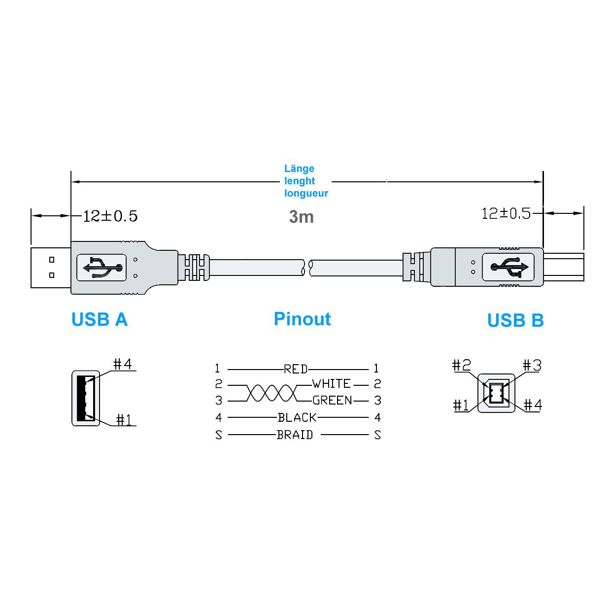 USB cable, 3m, for USB 2.0 and USB 1.1, high quality (28AWG1P / 24AWG2C), USB plug A to USB plug B (USB standard), colour: silver translucent