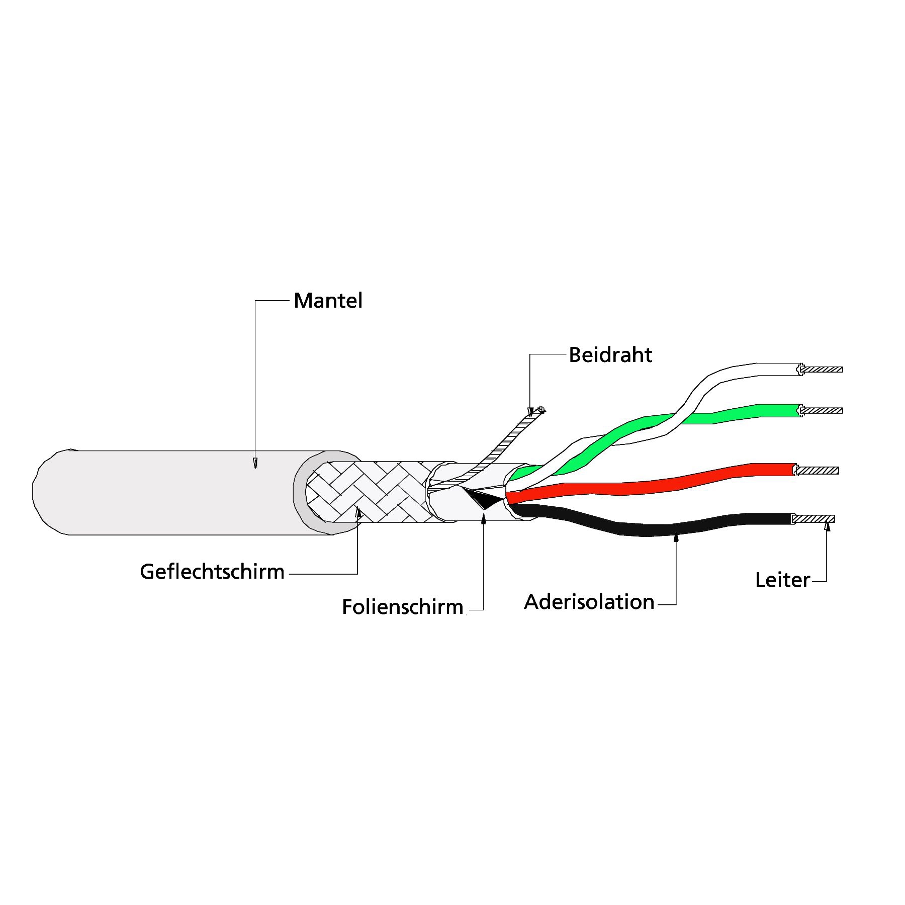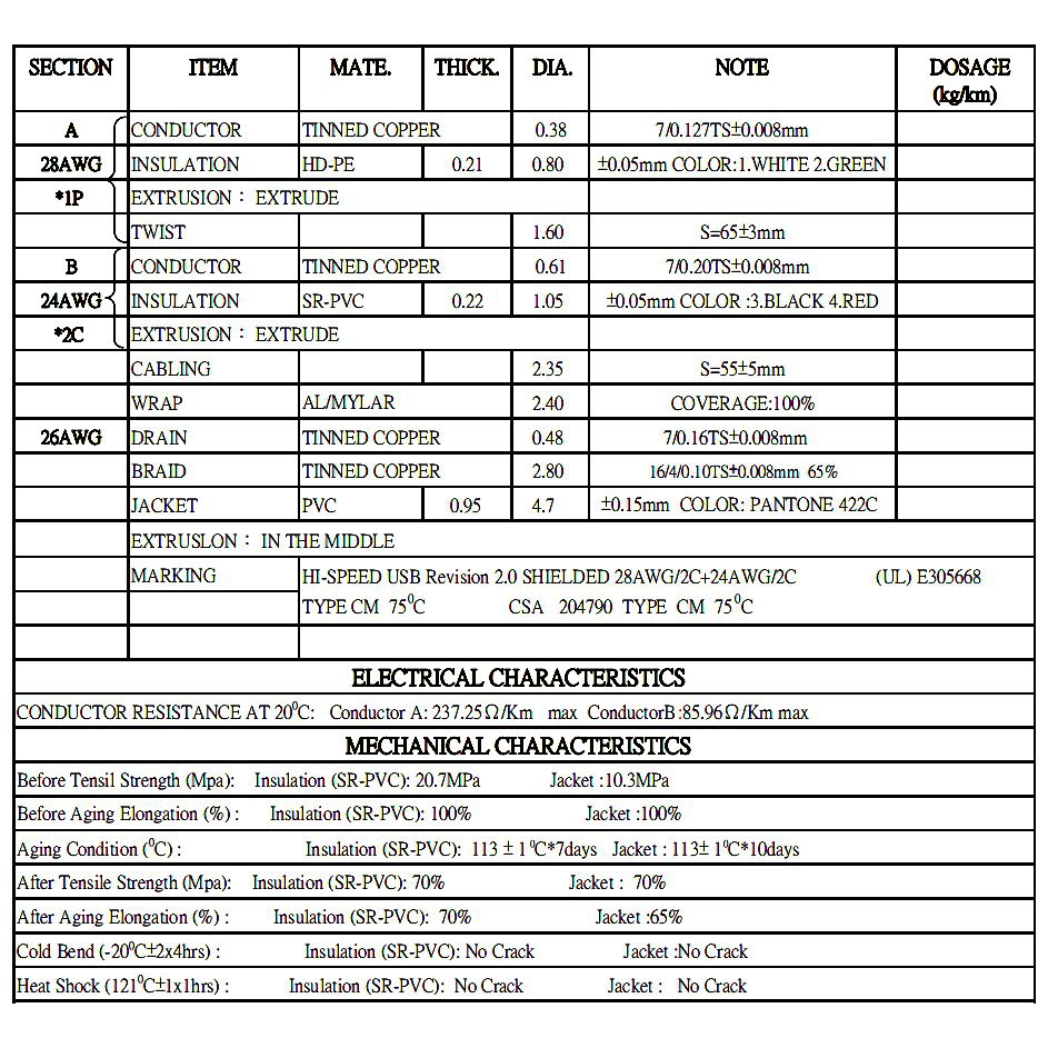 USB 2.0 cable, reel 100m, material meets USB standard: AWG28/1P (twisted pair data connection) AWG24/2C (5V power connection), double shielded (Al foil + braid shield), compatible USB 2.0, diameter 4,5mm, colour: grey