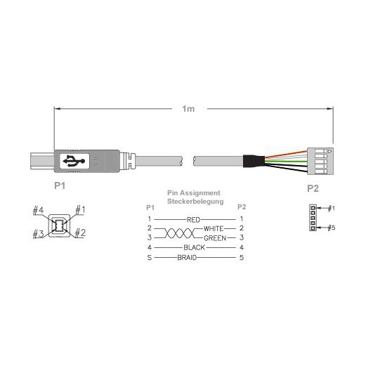 USB 2.0 cable, plug B male to 5 pin board connector, 1m