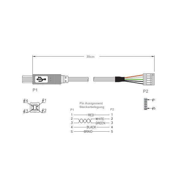 USB 2.0 cable, plug B male to 5 pin board connector, 30cm