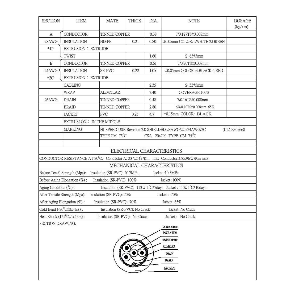 USB 2.0 cable, roll 100m, material meets USB standard: AWG28/1P (twisted pair data connection) AWG24/2C (5V power connection), double shielded (Al foil + braid shield), compatible USB 2.0, diameter 4,5mm, colour: black