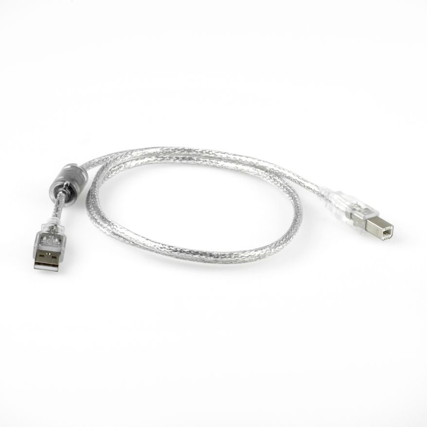 USB cable with ferrite core, 1m, very high quality: 28AWG/1P 24AWG/2C, double shield (covering 65%), for USB 2.0 high speed 480 Mbps, colour: silver translucent
