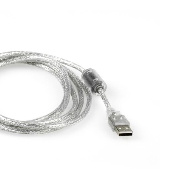 USB cable with ferrite core, 2m, very high quality: 28AWG/1P 24AWG/2C, double shield (covering 65%), for USB 2.0 high speed 480 Mbps, colour: silver translucent