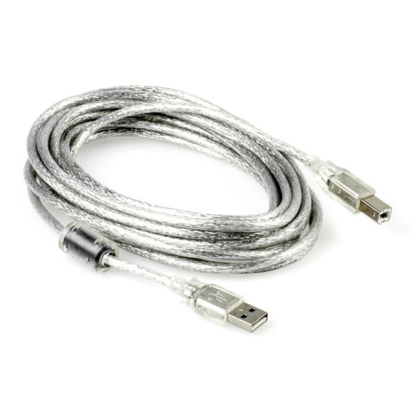 USB cable with ferrite core, 5m, very high quality: 28AWG/1P 24AWG/2C, double shield (covering 65%), for USB 2.0 high speed 480 Mbps, colour: silver translucent
