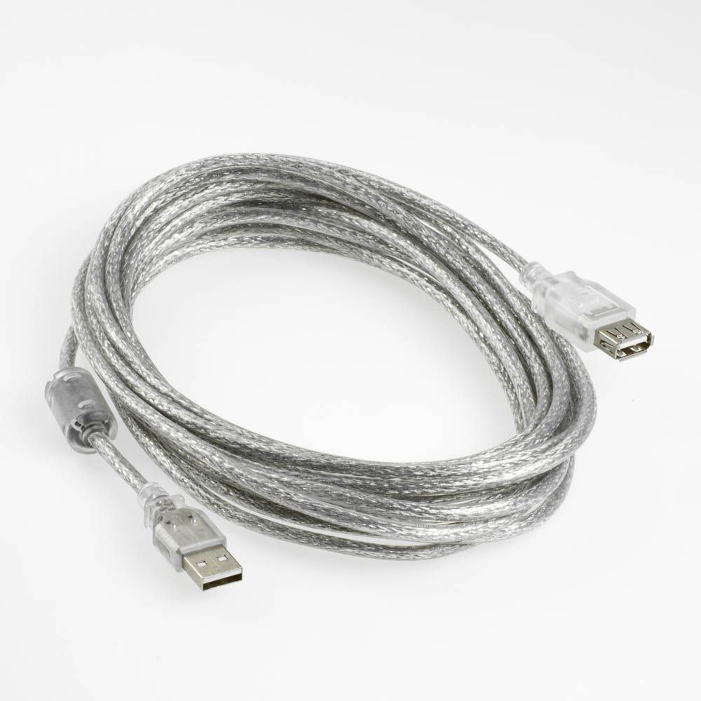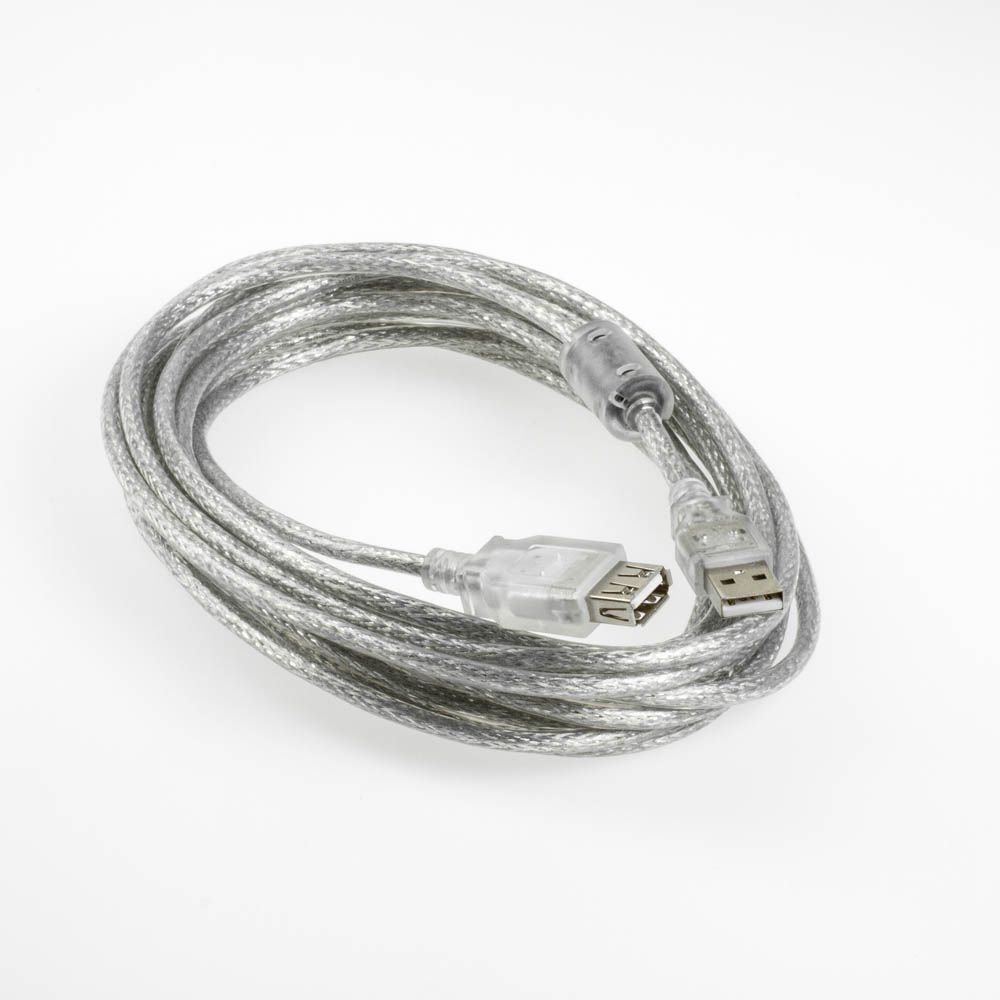 USB 2.0 extension cable, type A male to type A female, with ferrit core, 5m, colour: translucent silver
