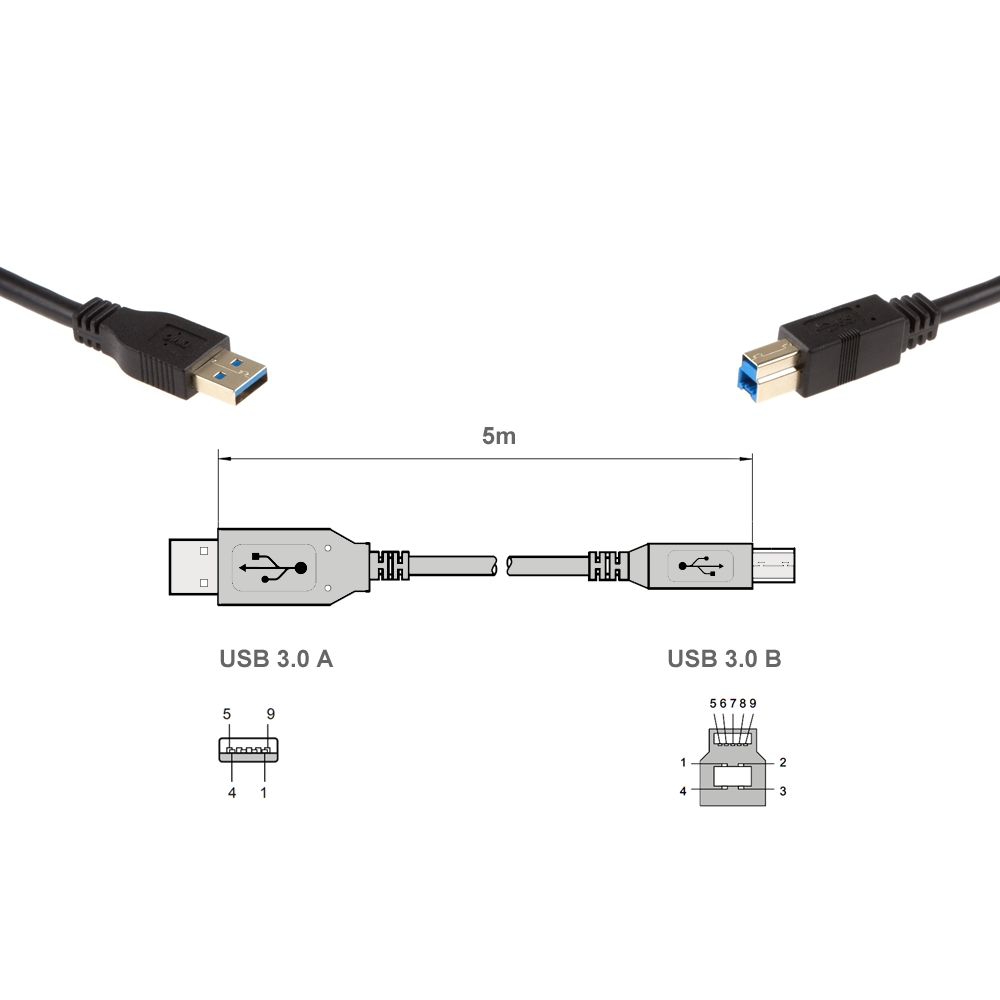 USB 3.0 cable, 5m, quality PREMIUM+ with thicker CU wires AWG26/28/22, double shielded, USB3 A plug male to USB3 B plug male, SuperSpeed 5Gbps, black