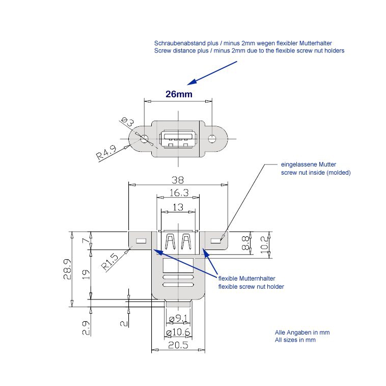 - connector 1: mountable USB 2.0 type A female (with screws)