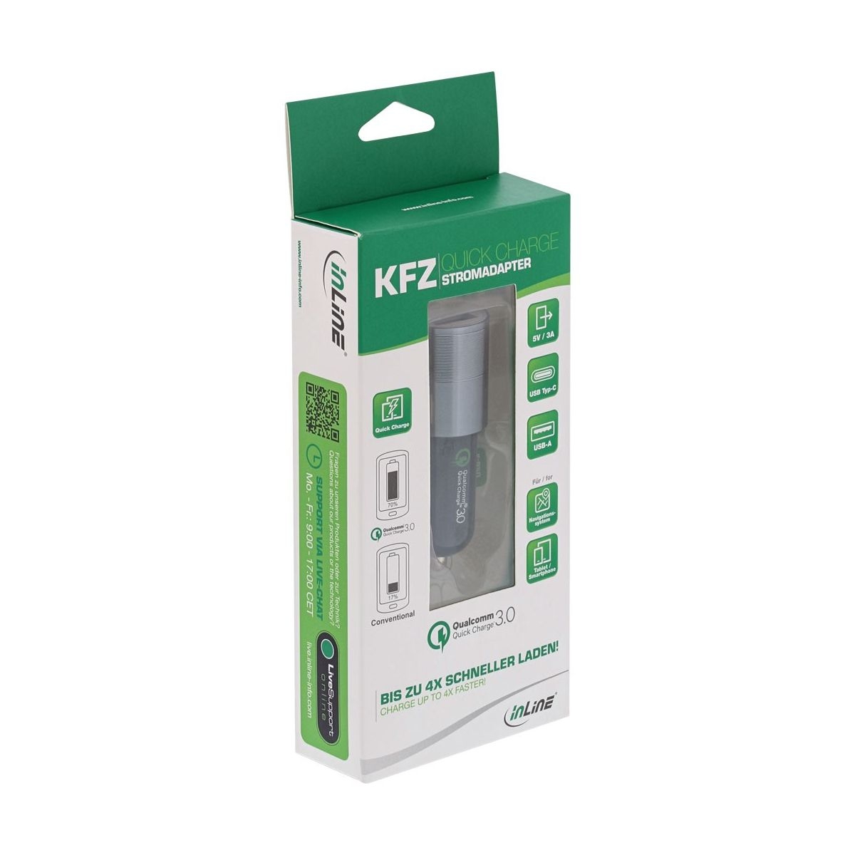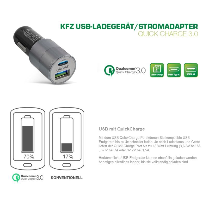 USB car charger power adapter, Quick Charge 3.0, 12/24VDC - 5V DC/3A, ports USB-A + USB Type-C, black