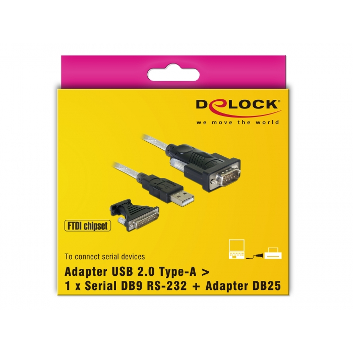 Adapter cable USB 2.0 to serial port (RS232), 1.8m, for PC, USB plug type A to DB9 male, DB25 adapter and software included, chipset: FTDI (old item no. USB2-0600)