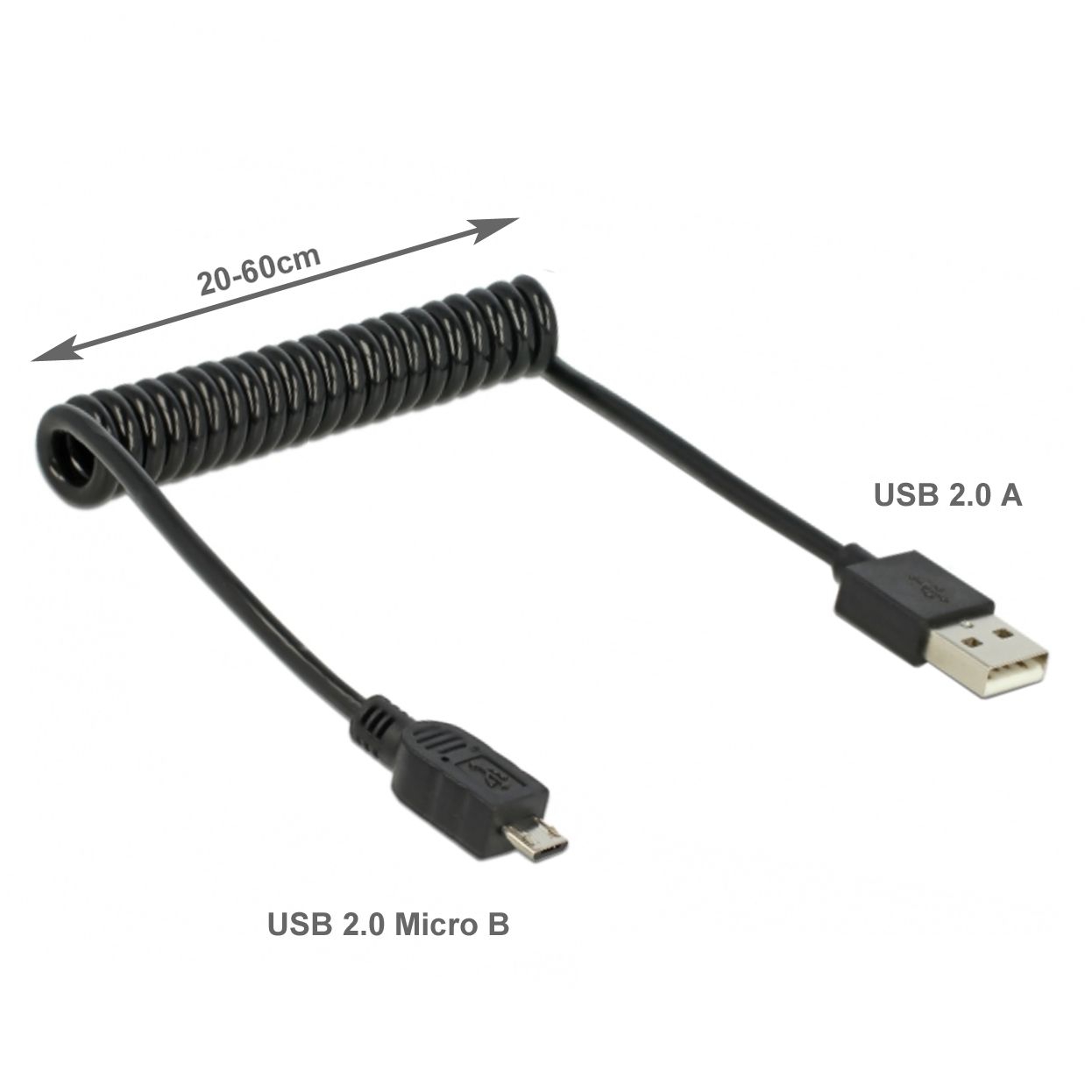 USB spiral cable / helix cable MICRO: USB plug A to Micro B plug, 30cm or extended about 60cm, USB 2.0 High Speed, e.g. for mobile phones, smartphones