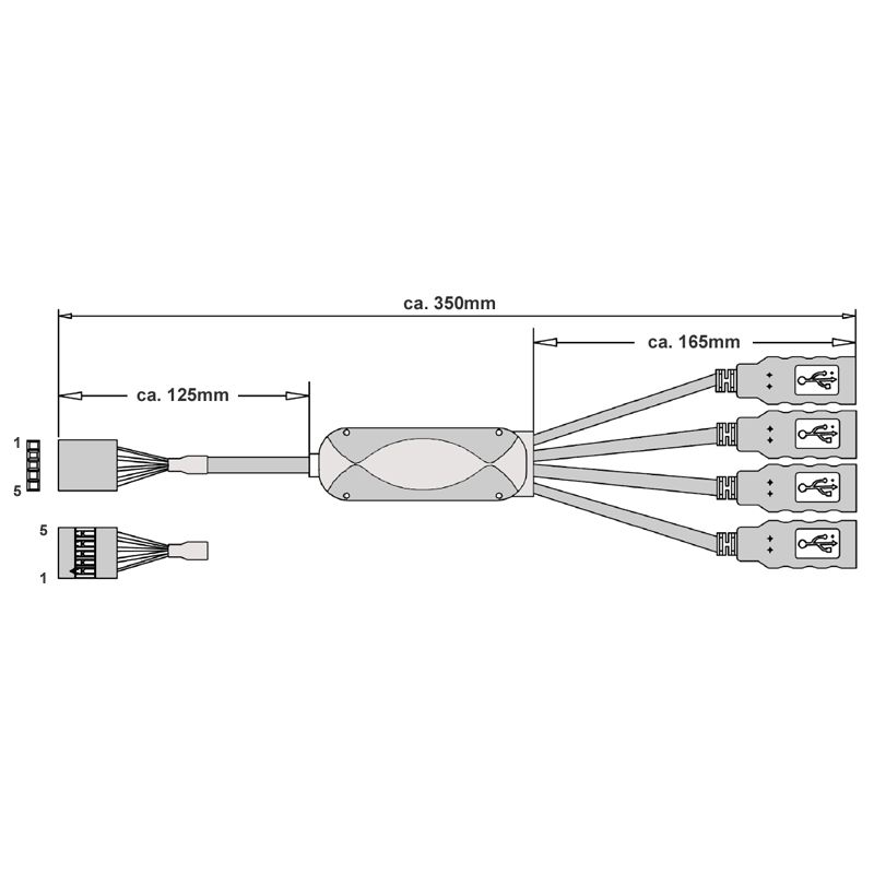 USB HUB with internal board connector, 4x USB A port (female), internal plug: 5-pin, grid 2.54mm (sequence of colours: red, white, green, black, shield), USB 2.0, max. 480 Mbps, works bus powered