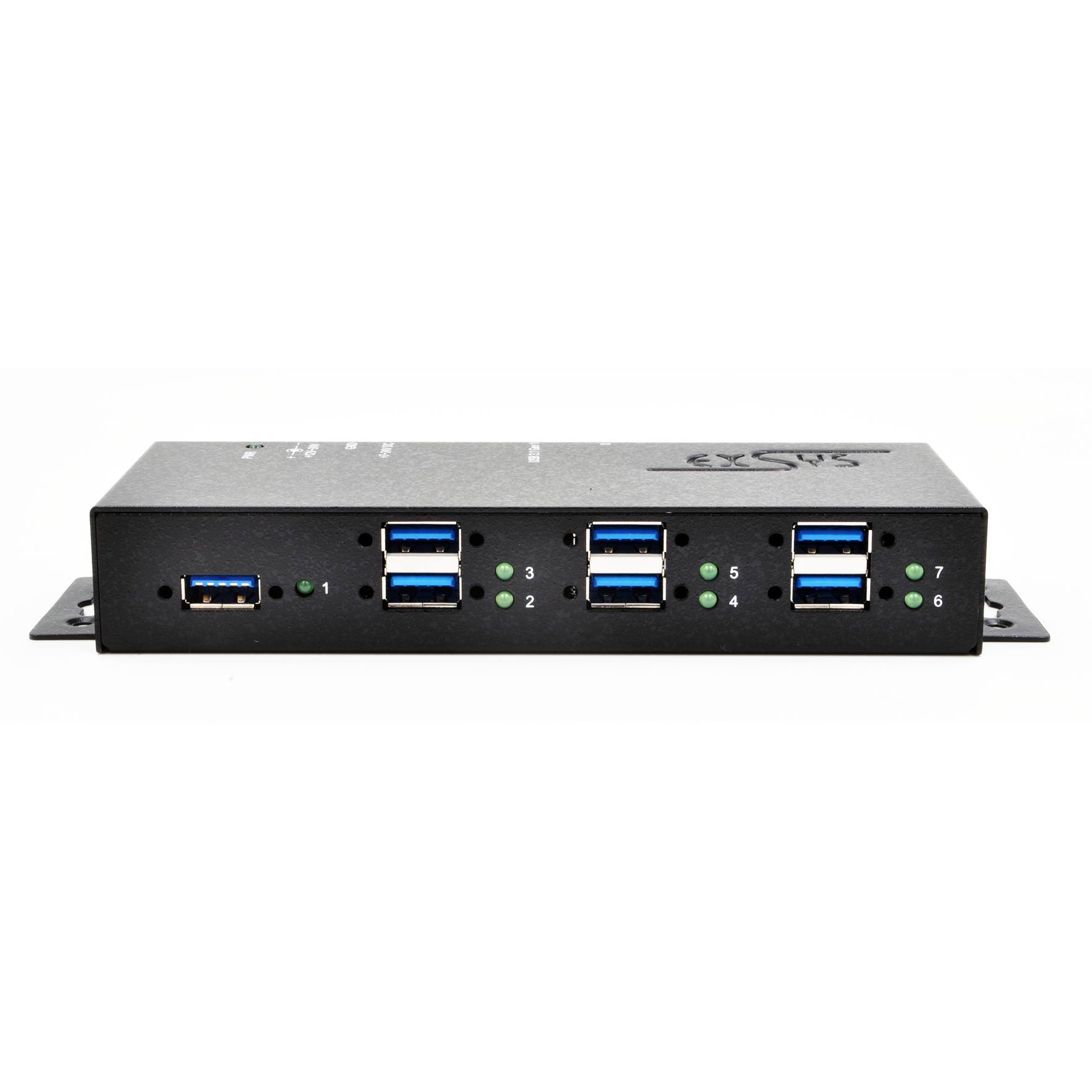The EX-1189HMVS-3 provides 7 USB 3.2 Gen 1 (previously called USB 3.0) screwable downstream ports with 15KV ESD surge protection for each output. In doing so, it simultaneously provides 1.5A power for up to 4 ports for charging iPhone, iPad, smartphone and tablet. The included EX-K1571V cable can be attached to the EX-1189HMVS-3 with thumbscrews without a screwdriver. It can be used in automation, industrial and office applications. Thanks to its special housing, the EX-1189HMVS-3 can be screwed to the wall, under a table or in a 19" cabinet (optional with EX-6099).