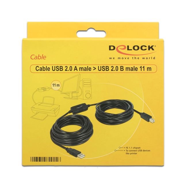 Very long USB cable, 11m, for USB 2.0 and USB 1.1, with integrated repeater (small booster box in the middle of the cable, 55x30x16mm), USB 2.0 High Speed (480 Mbps), plug A to plug B, high quality, colour: black