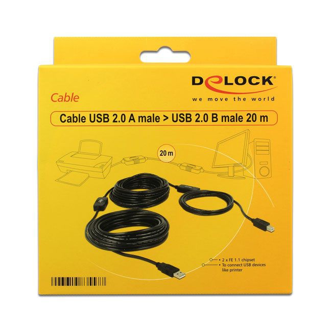Very long USB cable, 20m, for USB 2.0 and USB 1.1, with 2 integrated repeaters, USB 2.0 High Speed (480 Mbps), plug A to plug B, high quality, colour: black