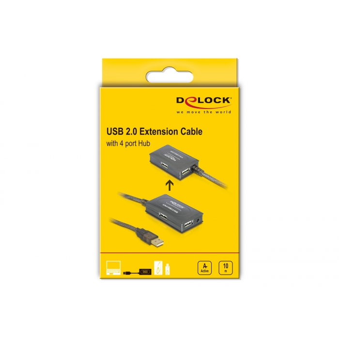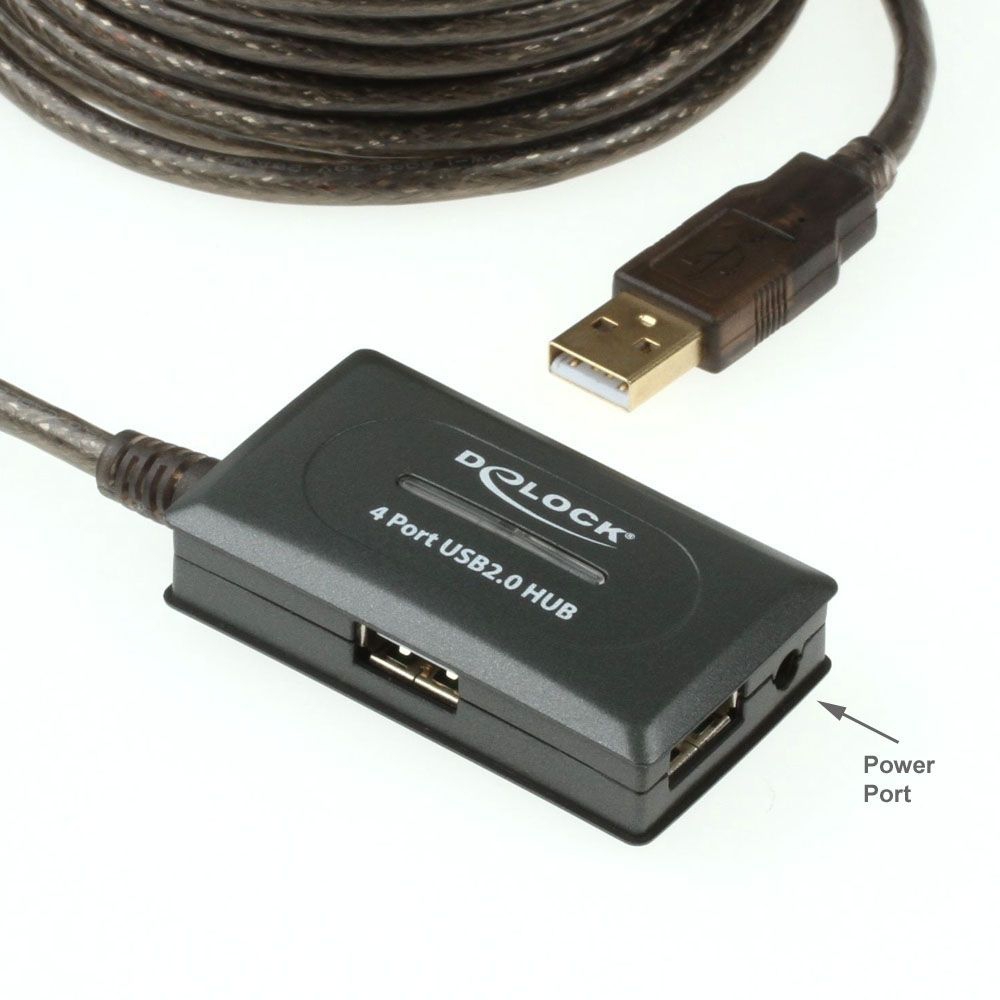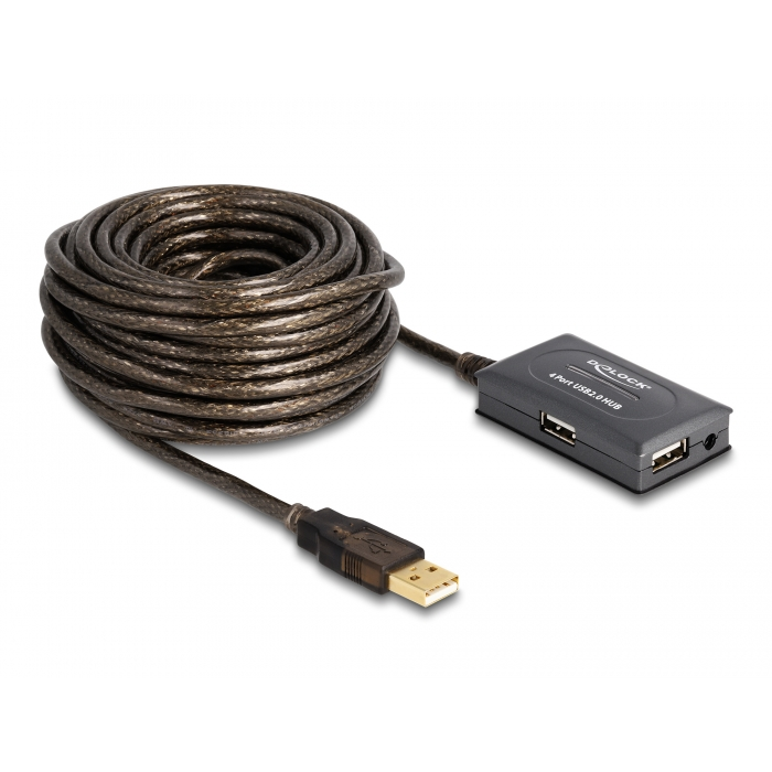 This USB extension cable by Delock can be connected to a USB port of your computer and enables an extension of 10 m. You can connect up to four USB devices to the Hub. In case these USB devices do not have an own power supply you may need an optional power supply, e.g. Navilock 41337, which can be connected to the Hub.