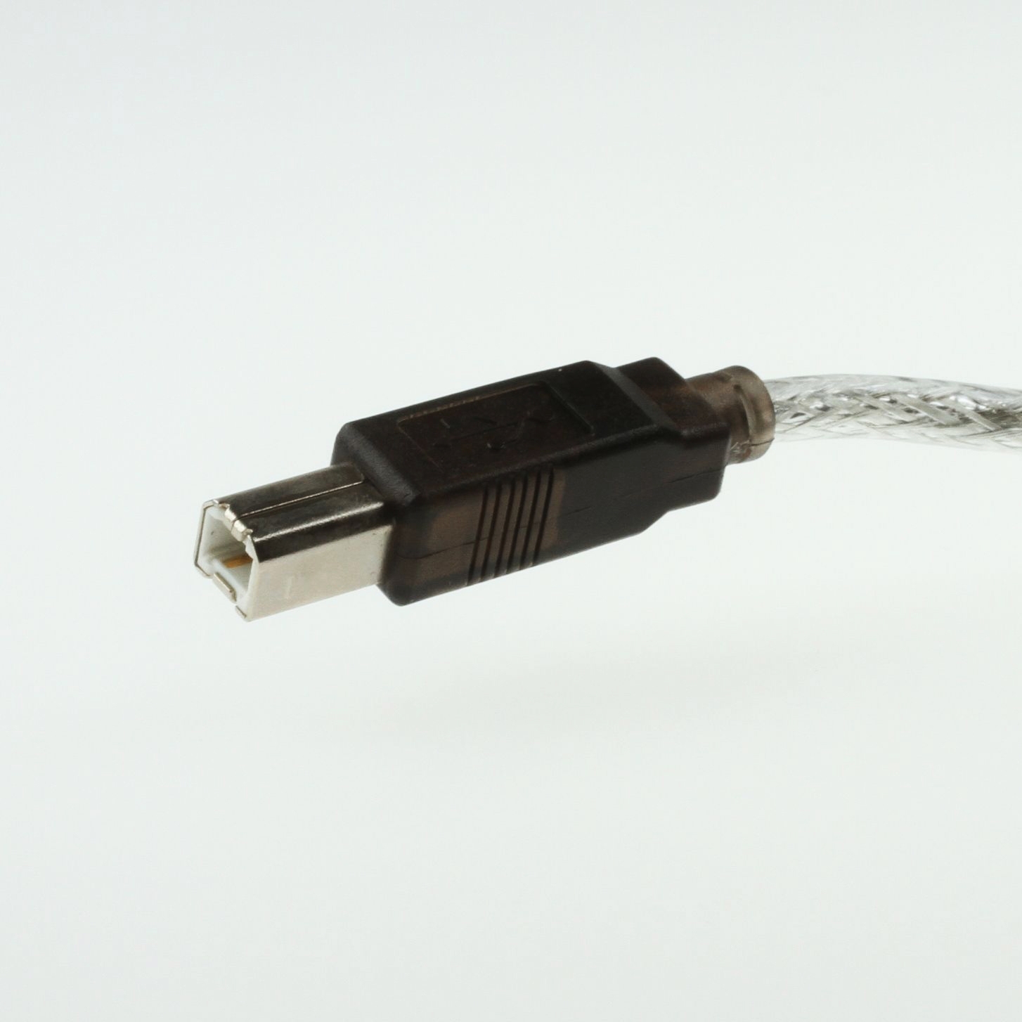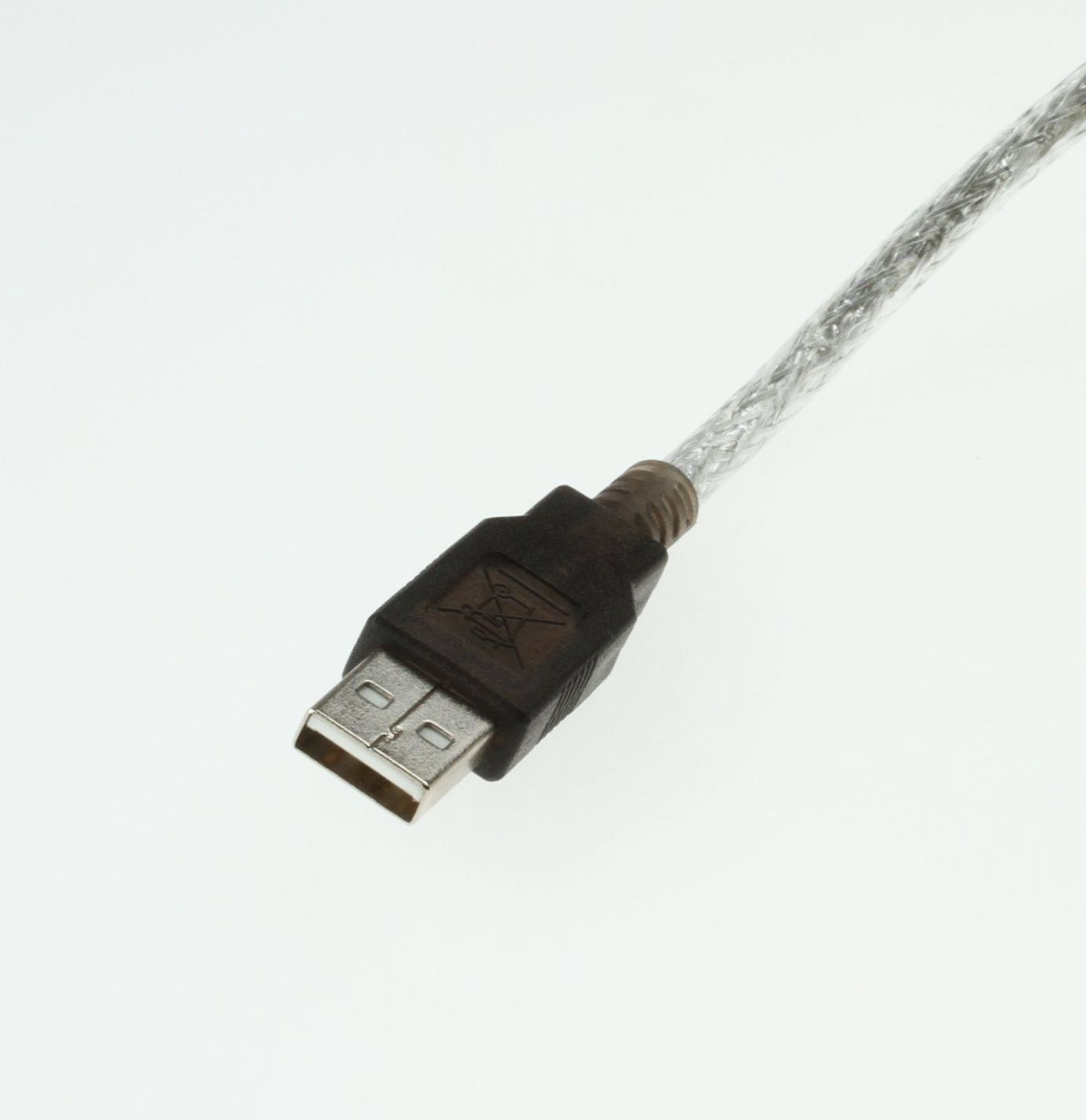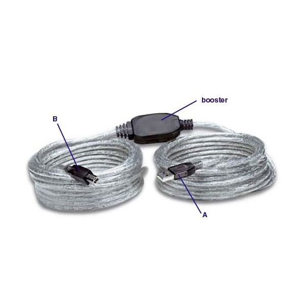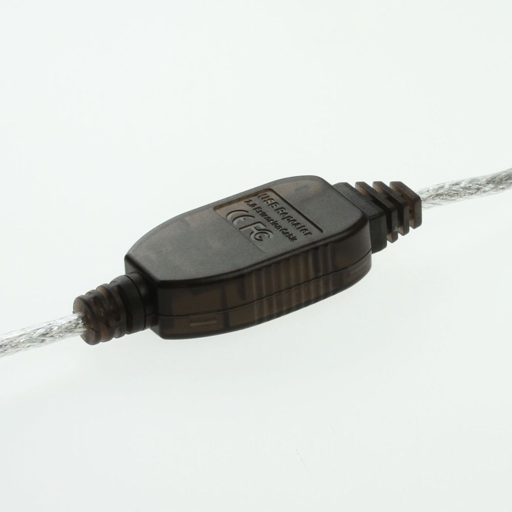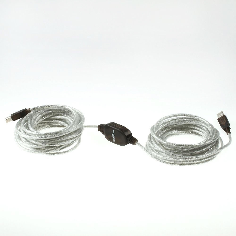 Very long USB cable, 11m, for USB 2.0 and USB 1.1, with integrated signal repeater (small booster box in the middle of the cable, 55x30x16mm), USB 2.0 High Speed (480 Mbps), plug A to plug B, high quality, colour: silber translucent