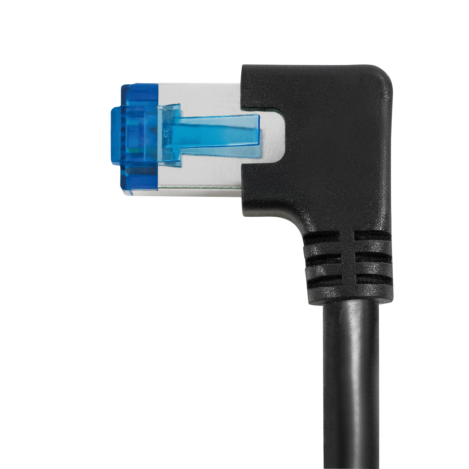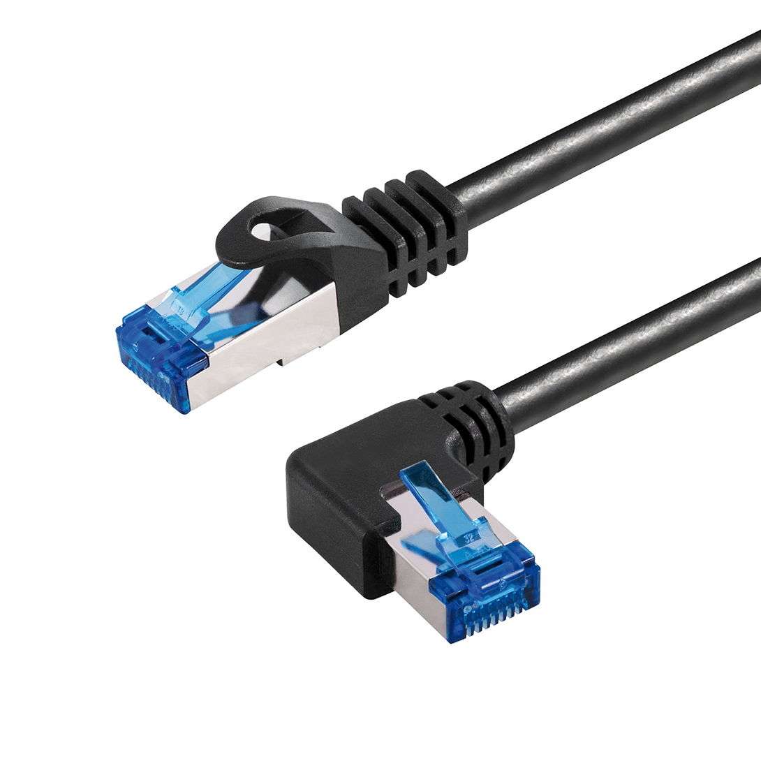 Cat.6A network cable, 1x RJ45 plug angled 90° LEFT, 1x RJ45 plug straight, AWG26 (CU), S/FTP (PIMF), black, 1m