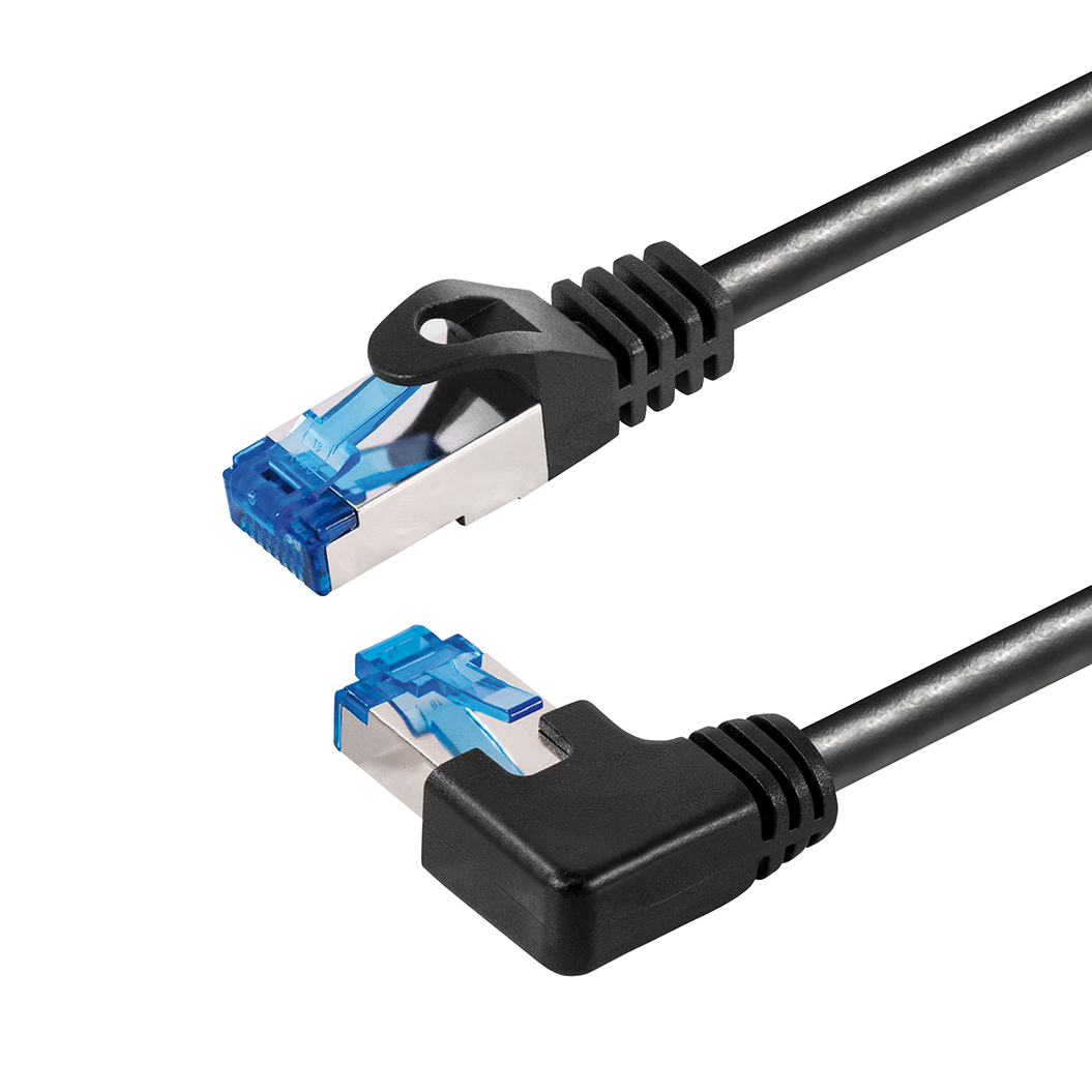 Cat.6A network cable, 1x RJ45 plug angled 90° RIGHT, 1x RJ45 plug straight, AWG26 (CU), S/FTP (PIMF), black, 1m