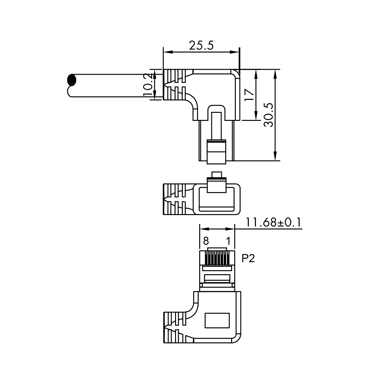 Cat.6A network cable 1x RJ45 angled RIGHT, 50cm