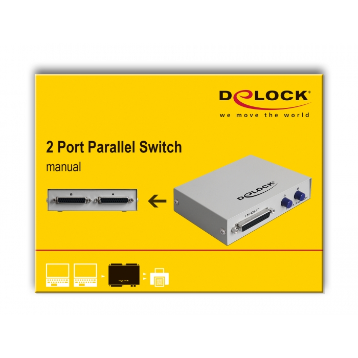 This parallel switch by Delock can be used for e.g. connection of a printer with parallel port to two systems by the help of the switch. By using one of the buttons it can be manually selected which system should be connected to the device. For the switch you do not need a power supply.