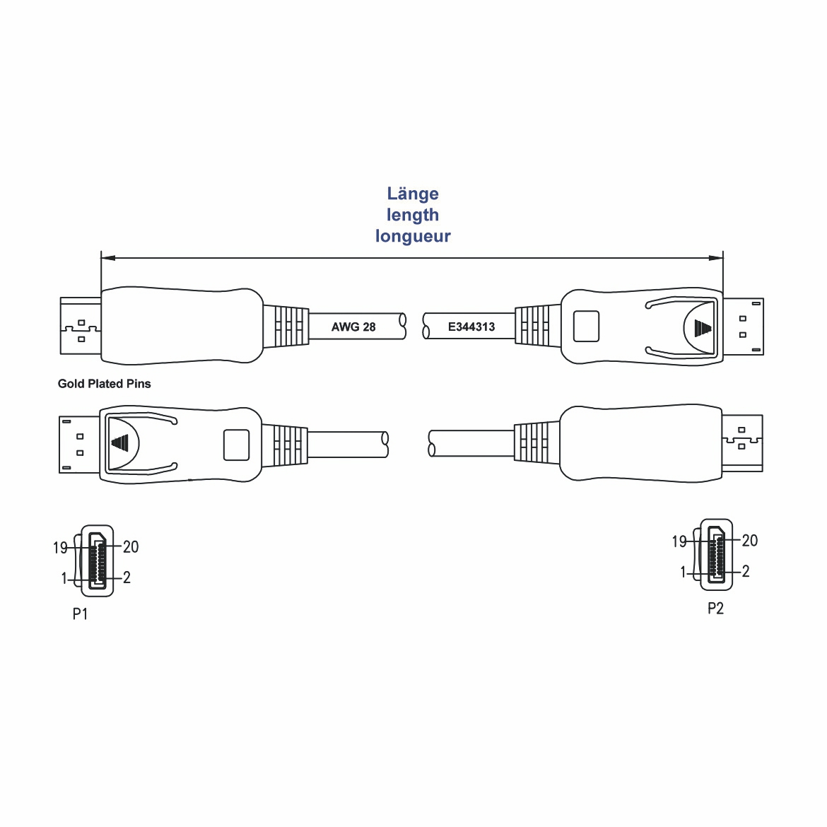- DisplayPort™ connector on both sides (male, 20-pin)