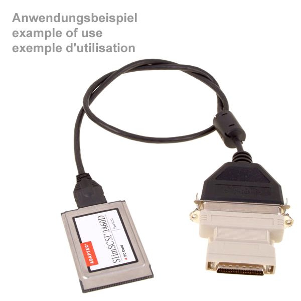 The SCSI adapter offered here is used to adapt a standard SCSI cable with a large 50-pin SCSI connector to HP-DSub-50 male (with contact pins). HP-DSub-50 connectors are sometimes also referred to as SCSI-II connectors or Mini-DSub-50. HP-DSub-50 sockets can be found, for example, on numerous SCSI-II controllers, scanners or external SCSI hard disk housings.