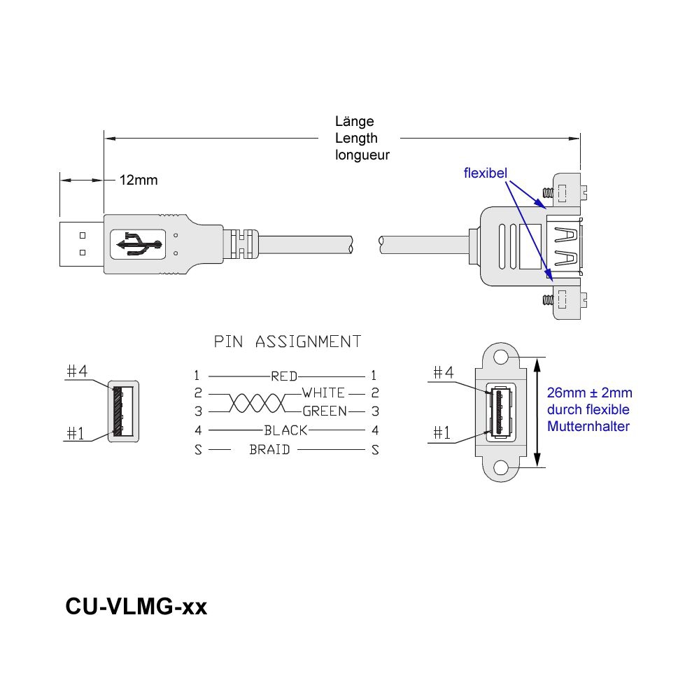 - copper wires with 28 AWG/1P (data, twisted pair), 24 AWG/2C (5V)