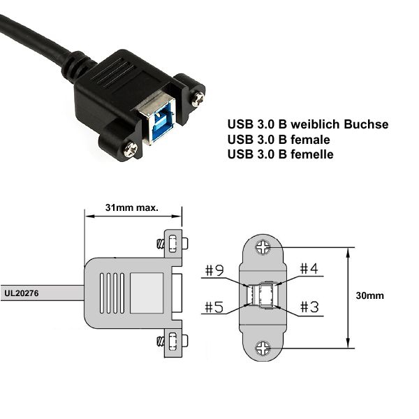 Mountable USB 3.0 cable B female with screws to B male 50cm